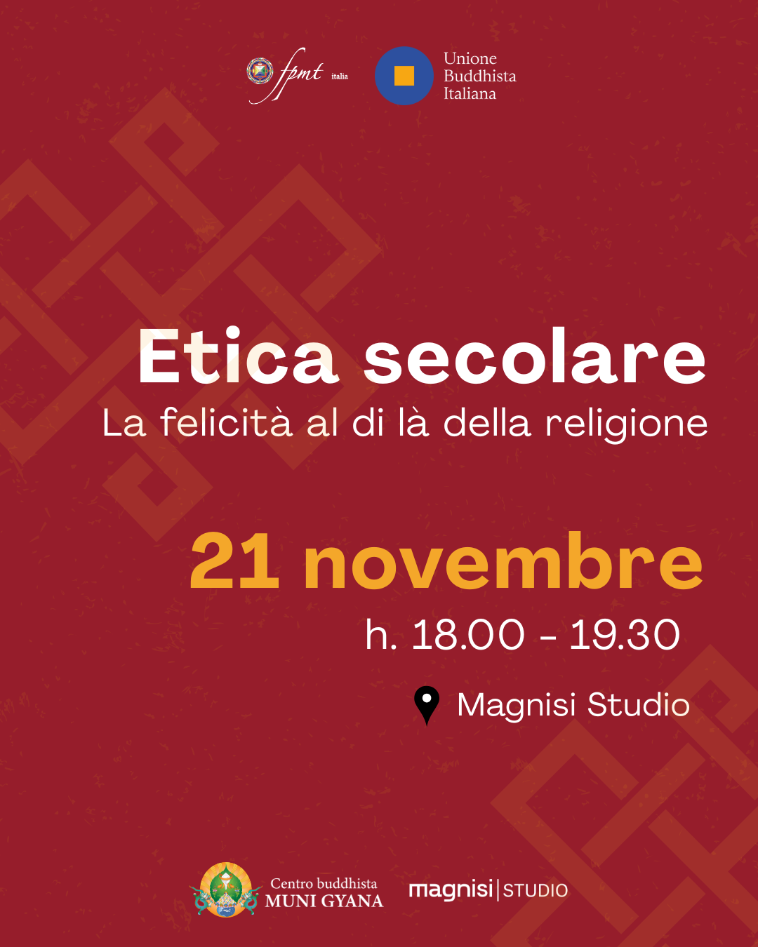 L’incontro “La felicità al di là delle religioni”, promosso dal Centro Buddhista Muni Gyana e ospitato al Magnisi Studio, è un momento di riflessione aperto a tutti, per esplorare insieme un’etica universale basata su valori condivisi da ogni essere umano: compassione, empatia, gentilezza, perdono, altruismo, tolleranza.